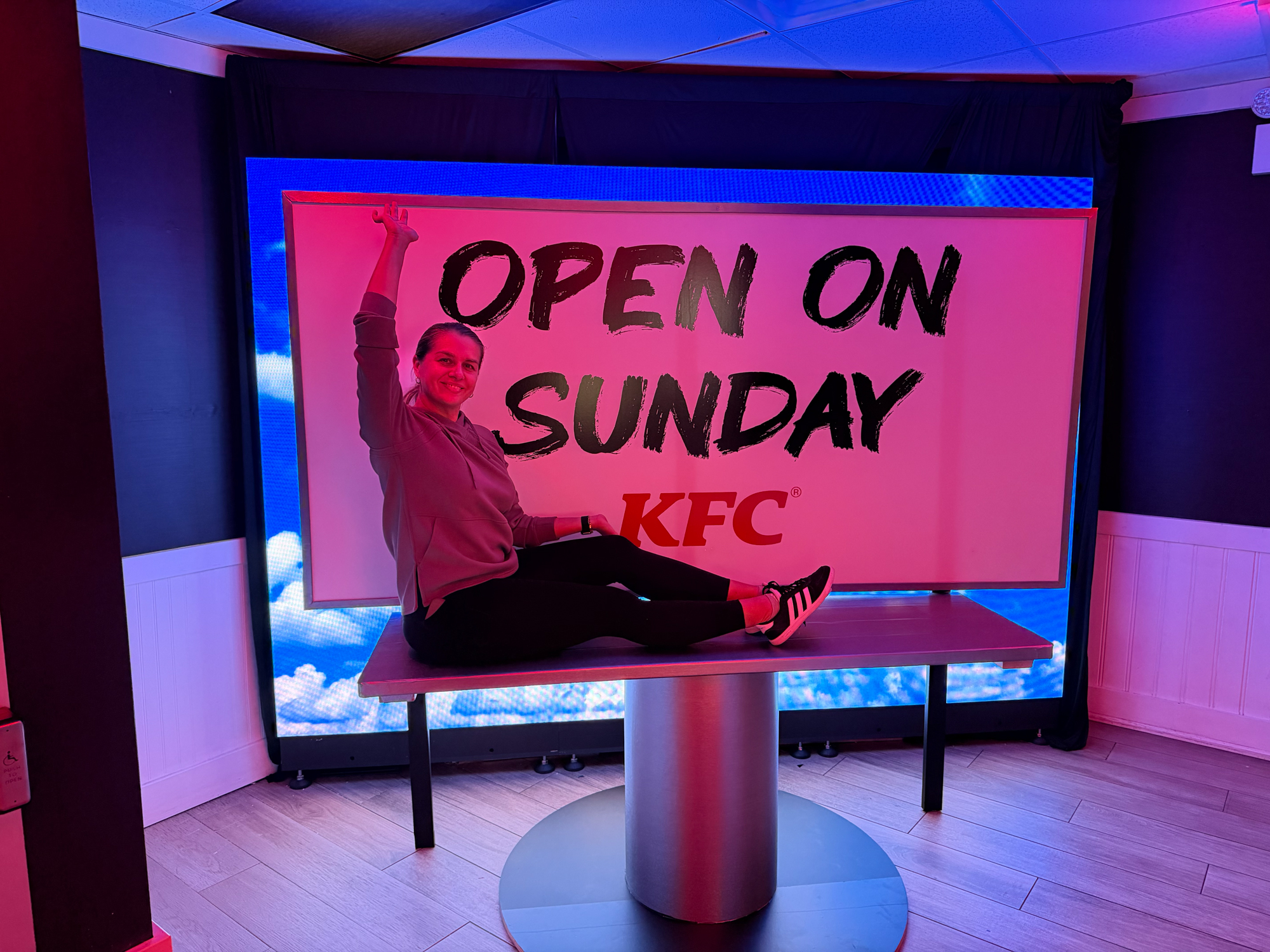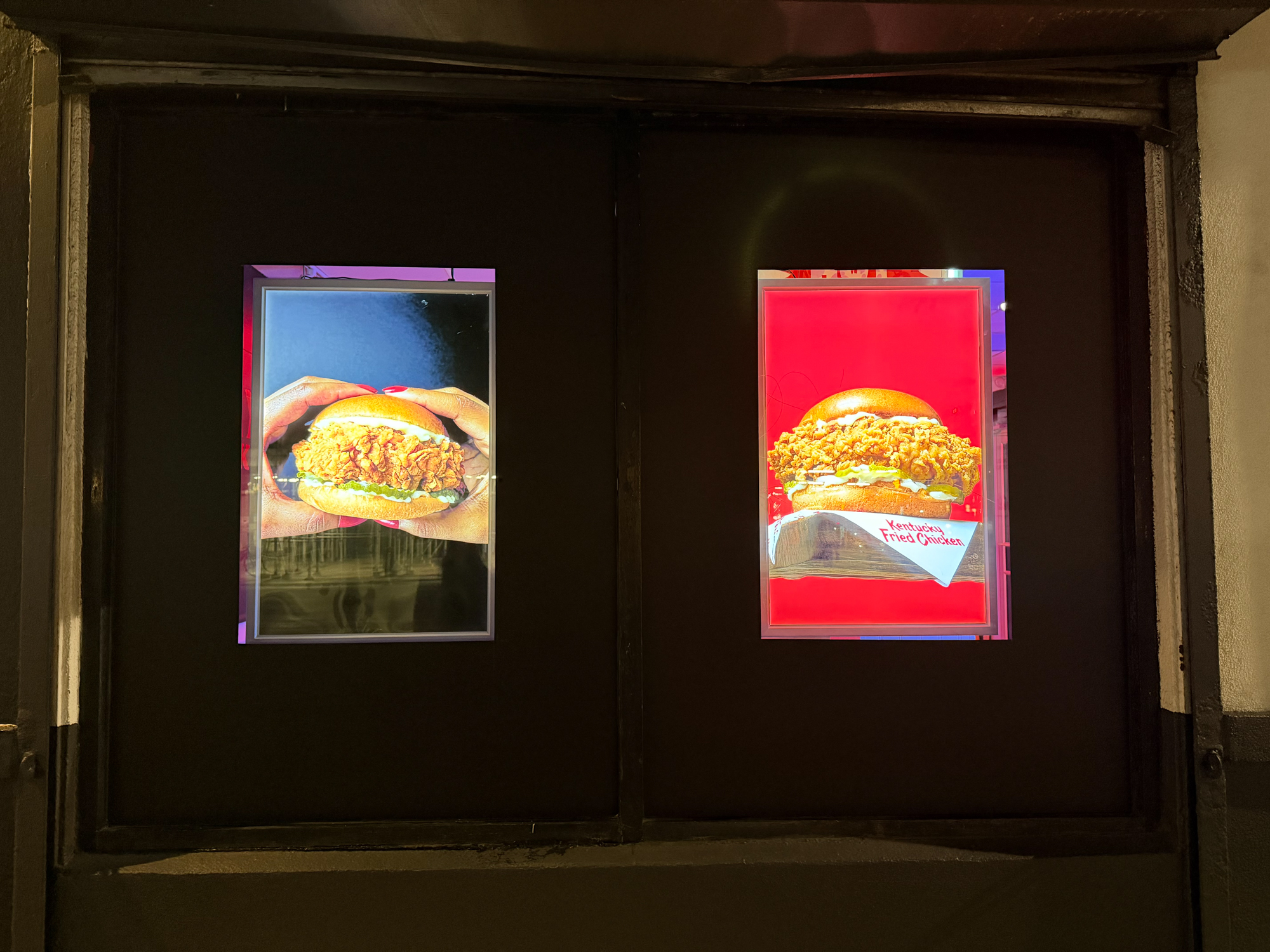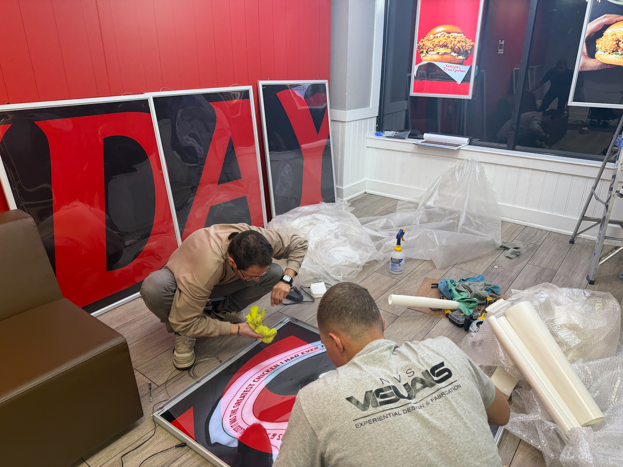 To begin, NVS wrapped the entire façade in a 36-foot-wide, 17-foot-tall mural that introduced the Sundays identity at street level. Additionally, we produced a custom spot gloss technique to make the headline text appear three-dimensional, while the matte background created a strong contrast. Furthermore, we fabricated a custom LED marqueethat fully covered the existing KFC signage, allowing the building to feel like an entirely new restaurant from the moment guests arrived. We also installed matte black window film and double-sided LED frames, which helped extend the takeover both inside and outside. As a result, the exterior appeared unified and immersive before guests even entered the space.