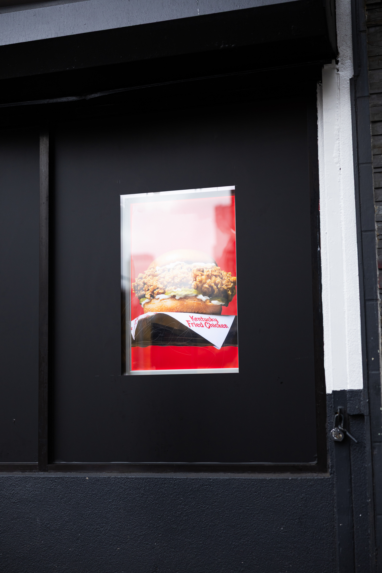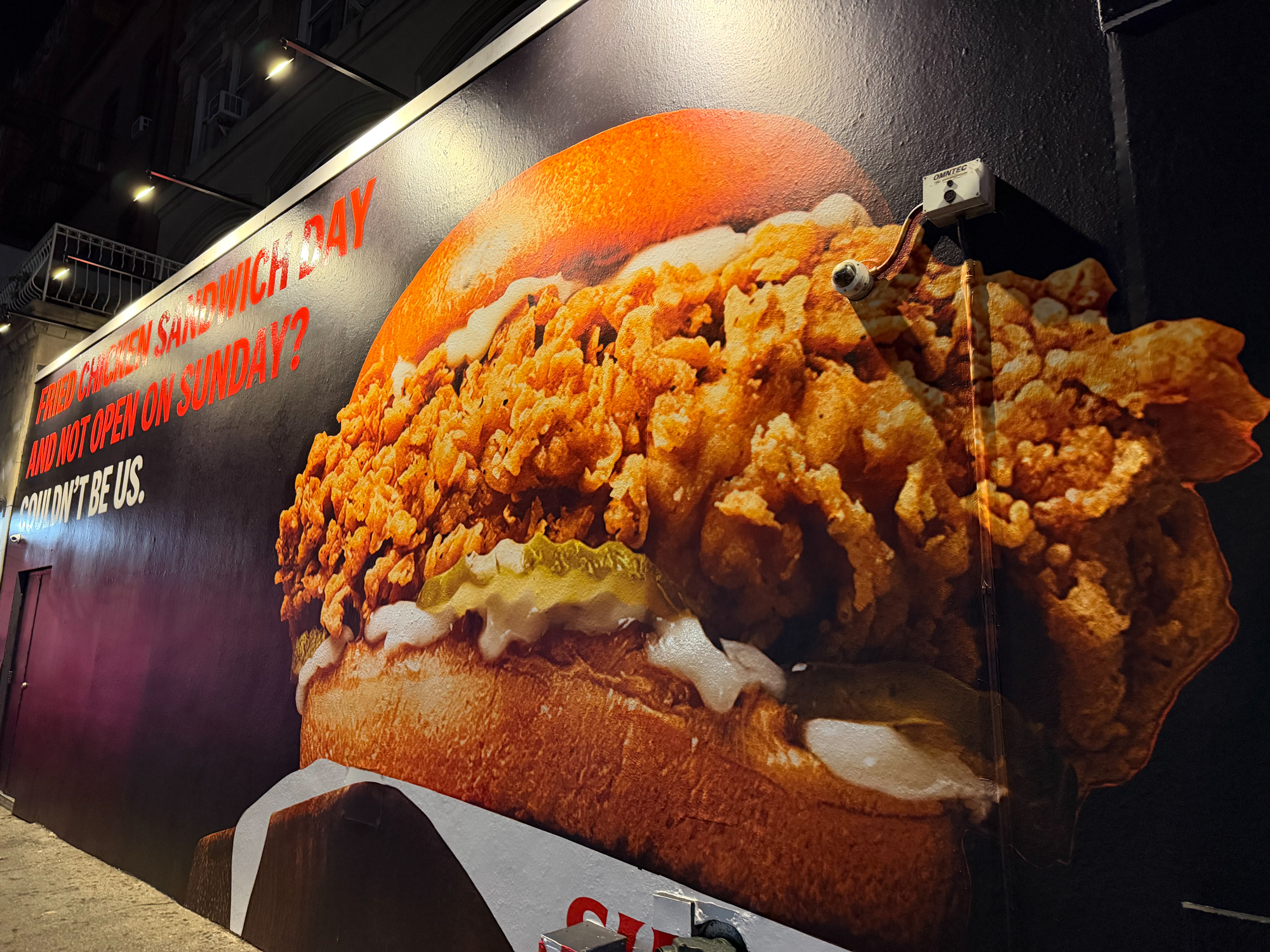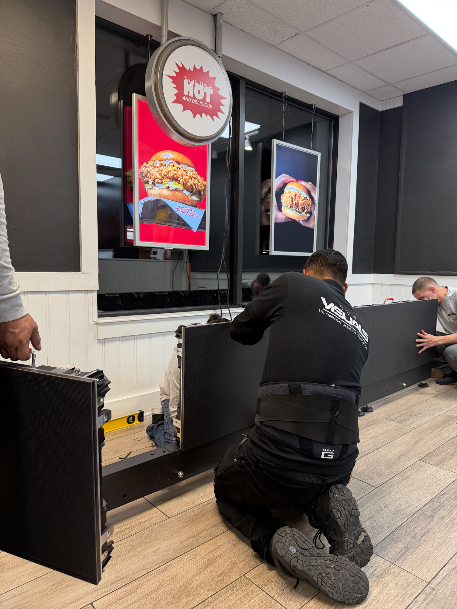 To begin, NVS wrapped the entire façade in a 36-foot-wide, 17-foot-tall mural that introduced the Sundays identity at street level. Additionally, we produced a custom spot gloss technique to make the headline text appear three-dimensional, while the matte background created a strong contrast. Furthermore, we fabricated a custom LED marqueethat fully covered the existing KFC signage, allowing the building to feel like an entirely new restaurant from the moment guests arrived. We also installed matte black window film and double-sided LED frames, which helped extend the takeover both inside and outside. As a result, the exterior appeared unified and immersive before guests even entered the space.