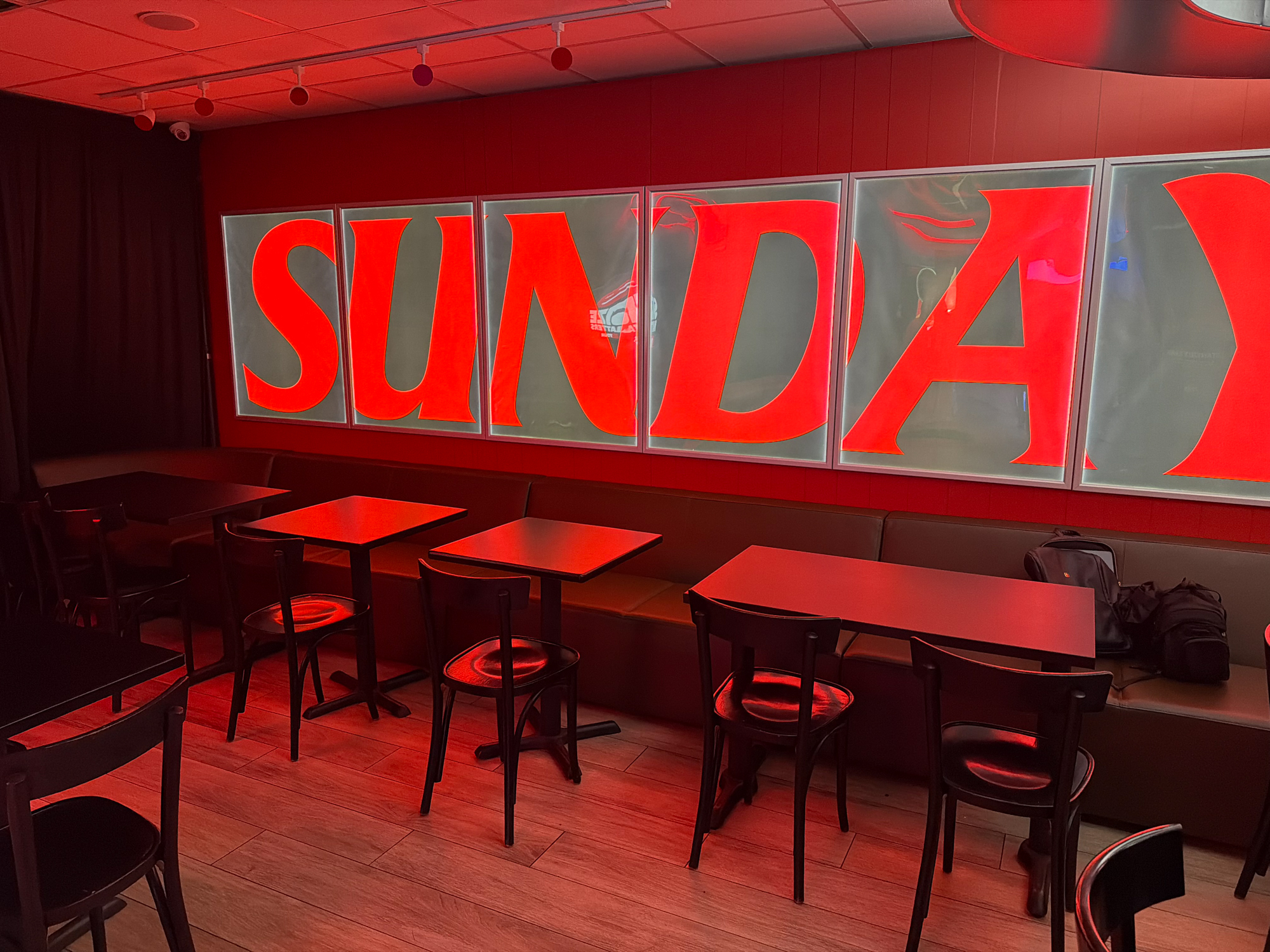 Inside the restaurant, NVS continued the transformation with a full environmental redesign. To start, we built scenic flats and temporary walls that reshaped the floor plan and created new branded rooms. In addition, we wrapped the counter, installed eight custom LED frames, and applied custom-printed grasscloth wallpaper across the interior. We also wrapped all existing lighting fixtures to shift the mood instantly. On top of that, every table was wrapped in matte black to match the Sundays palette. Finally, we sourced and installed brown leather sectionals, extra seating, and new window treatments, which together created a polished and cohesive aesthetic.