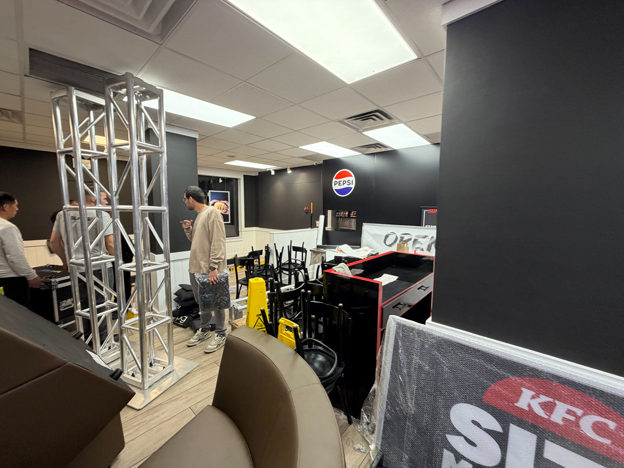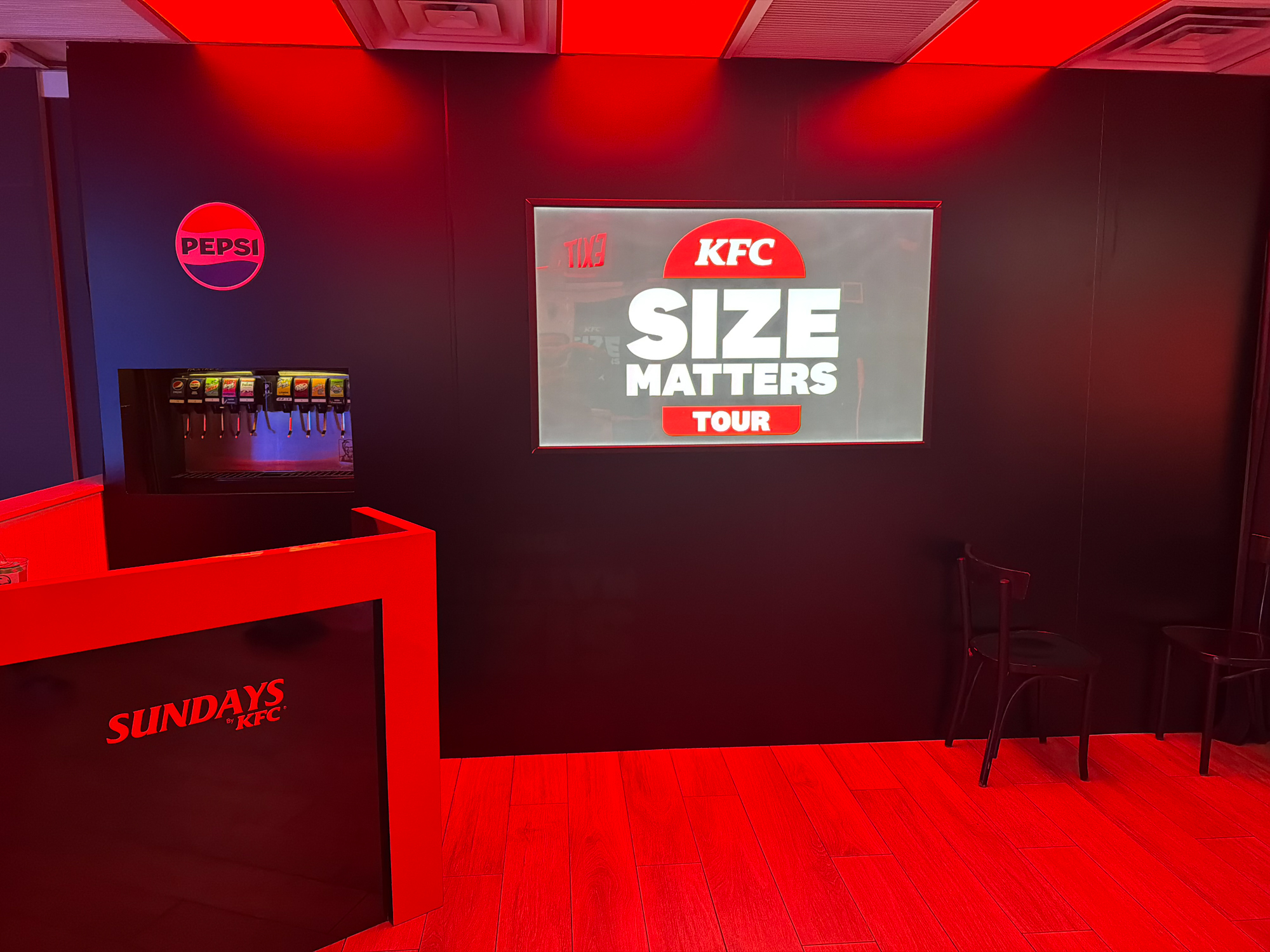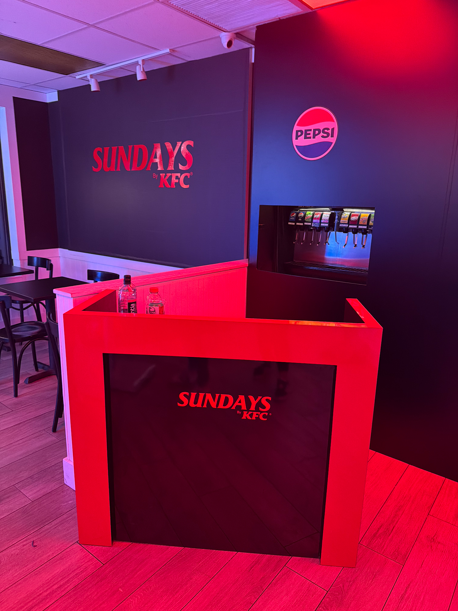 The branded pop up for KFC Sundays was a full-scale transformation of the KFC at 14th Street and Second Avenue, produced with Small Girls PR for National Chicken Sandwich Day on November 9th. The activation was designed as a complete brand takeover pop up, turning an everyday fast-food restaurant into a new dining concept for one day only. NVS Visuals joined the creative process early, and as a result, we were able to guide the concept into a practical plan that could be executed within the tight 14-day window. Throughout the process, our team handled design support, fabrication, graphics, lighting, furniture sourcing, and installation—ensuring everything remained coordinated and on schedule.